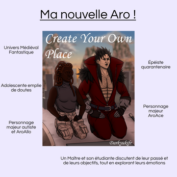 Avec Create Your Own Place, j’ai voulu mettre en lumière une relation intergénérationnelle entre deux personnages aromantiques, Archangelo et Dia, dans un univers Médiéval Fantastique. Ils font partie de mes OCs principaux et écrire ces mots sur leur amitié était vraiment libérateur !